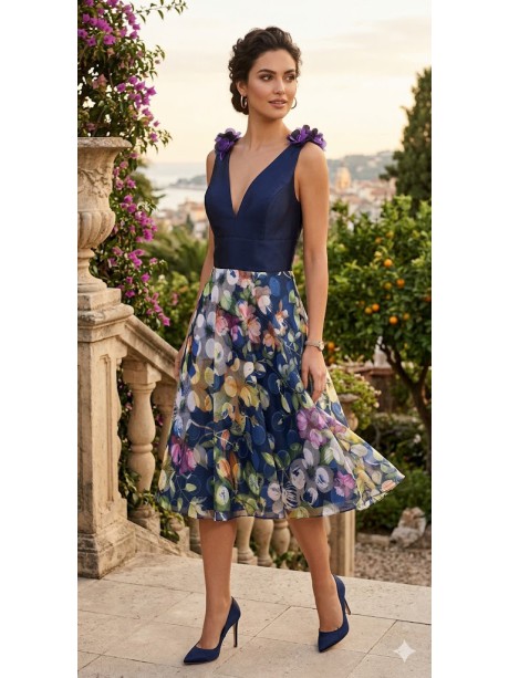 El vestido de fiesta corto Lola azul estampado de Nuribel es una opción elegante y actual para invitadas que desean brillar en eventos especiales. Su parte superior en satén azul marino resalta por el escote en V profundo y los tirantes adornados con flores en relieve, que aportan un toque romántico y sofisticado. La falda con vuelo y estampado floral multicolor equilibra frescura y vitalidad, logrando un contraste perfecto con el cuerpo liso. Este diseño favorecedor resalta la silueta y aporta movimiento, convirtiéndose en una elección ideal para bodas de día, bautizos, comuniones o celebraciones donde quieras deslumbrar con un estilo único. Un vestido que combina feminidad, modernidad y distinción en cada detalle.
